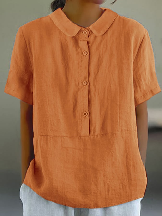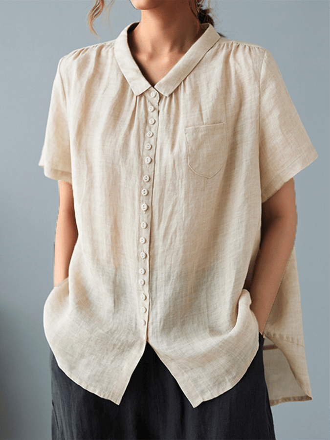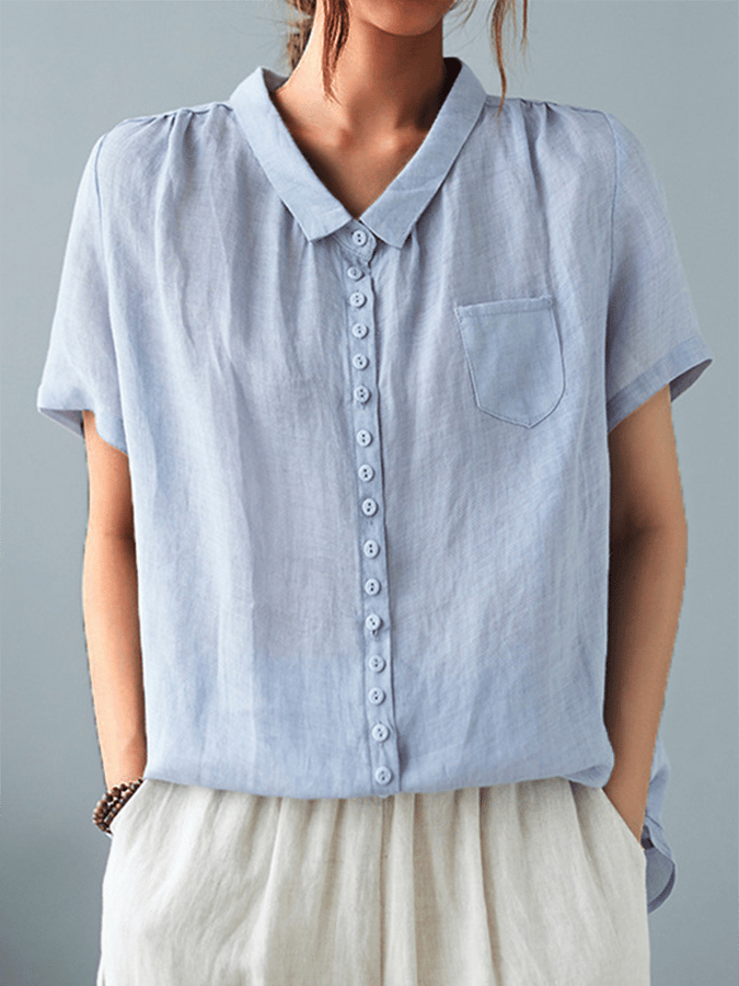 Women's Solid Color Cotton And Linen Lapel Short Sleeved Casual Blouse