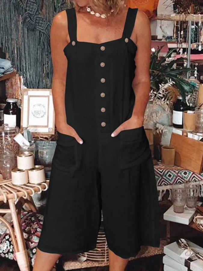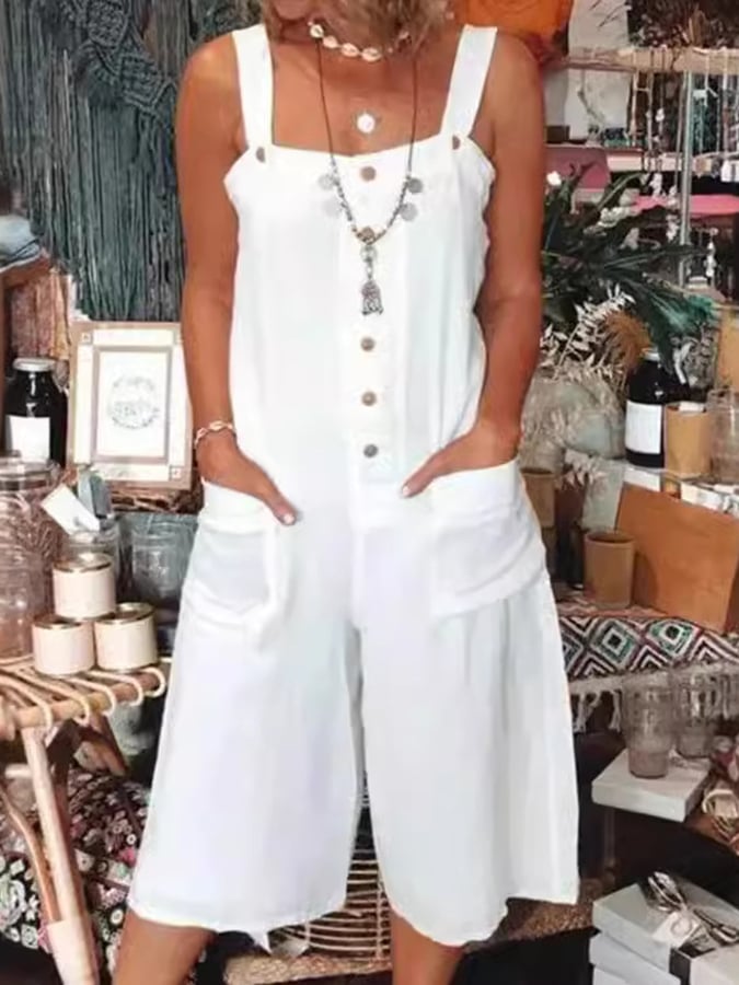Women's Fashion Solid Color Loose Pocket Button Jumpsuit