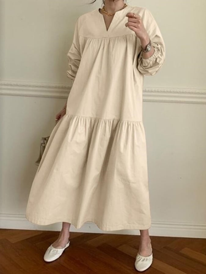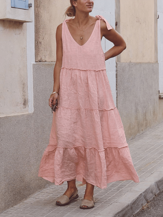Women's Solid Color V Neck Cotton Linen Dress
