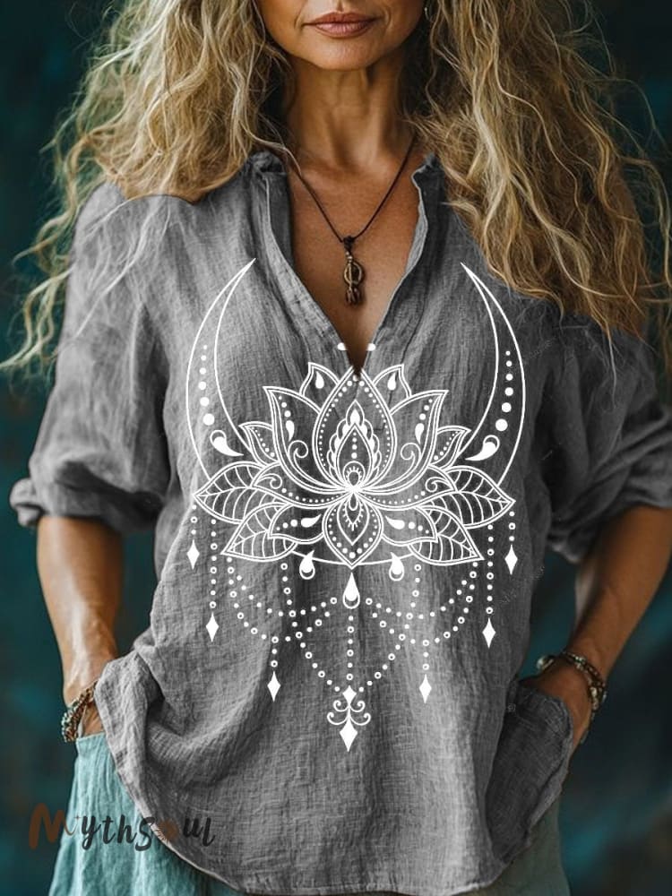Women's Vintage Moon Mandala Lotus Symbol Print V Neck Shirt